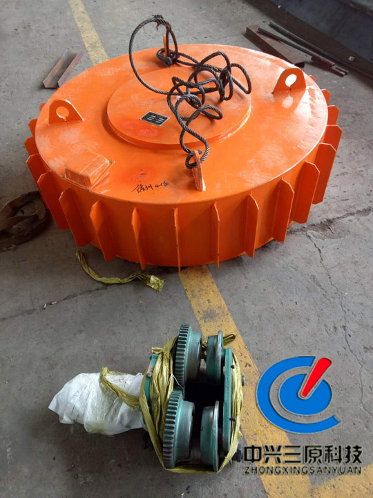 安徽客戶輸煤段配套一臺電磁除鐵器 適應皮帶寬度:B=1400mm、 磁場強度:≥70mT 額定吊高:400mm 技術(shù)特點: 1、磁路采用計算機模擬設(shè)計,透磁深度大,磁力強。 2、內(nèi)部采用電工專用樹脂澆注,自冷式全密封結(jié)構(gòu),防塵,防雨,防腐蝕。 3、可有效吸除混雜再非磁性物料中0.1-50KG的鐵磁性物質(zhì)。